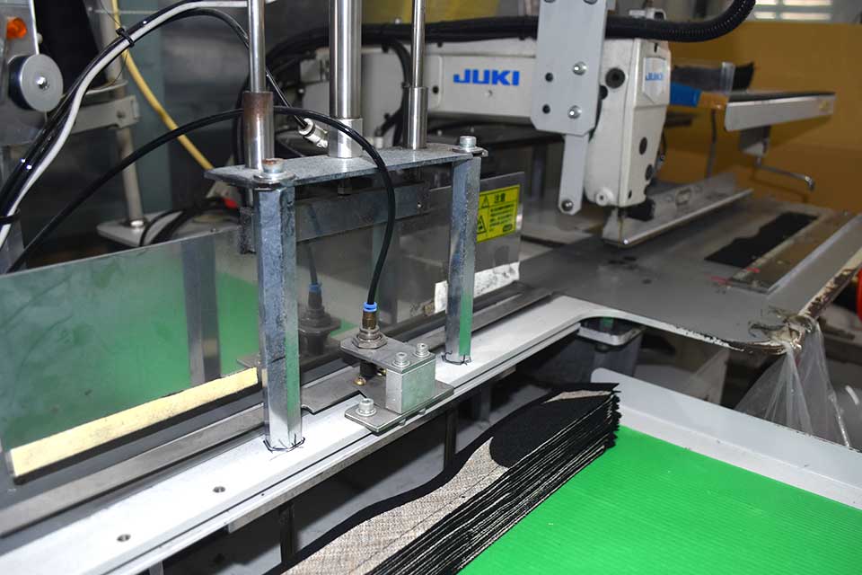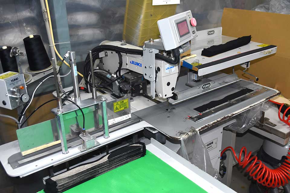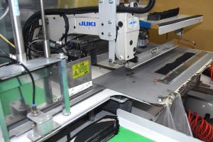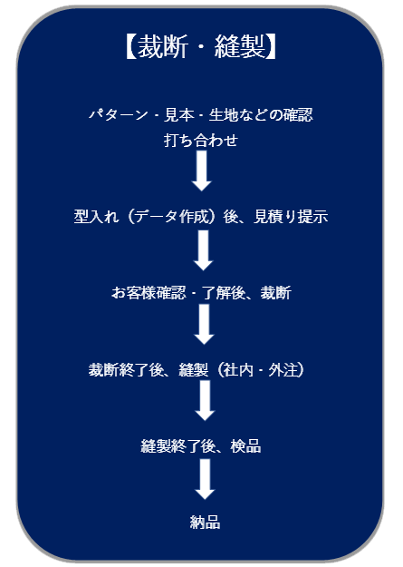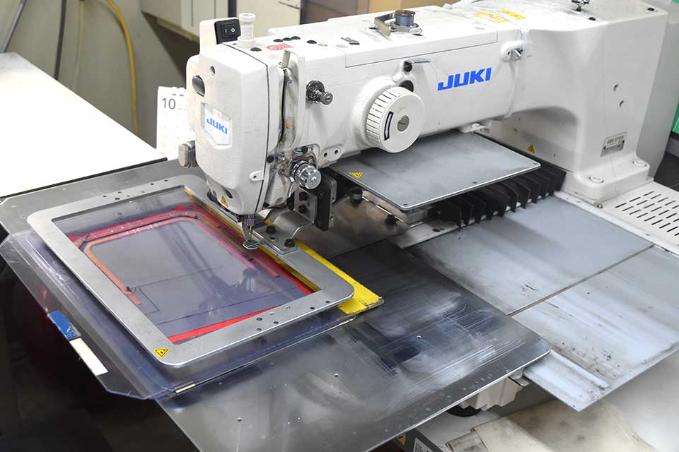 自動裁断機で精密裁断したものを、自動上衣腰ポケット袋縫いや、自動機による直線裄綿縫い、パターンゲージによる曲線裄綿縫い等、精密な付属材料の縫製に対応します。 また、自動機で対応できないものについては、約15の外注加工に職出し、熟練作業者による素材に応じた加工をしています。